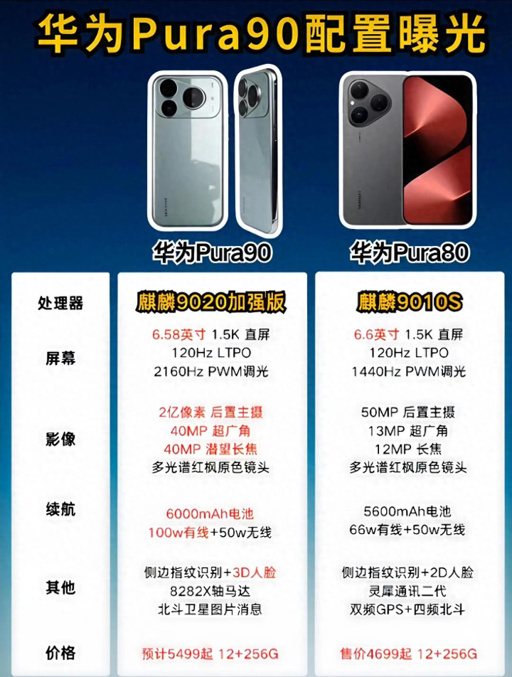 • 预算4000-5000元,日常使用:直接冲标准版Pura90,4699元就能享受到麒麟9020、6500mAh大电池、100W快充、直屏、可变光圈主摄,日常使用完全够用,性价比最高;